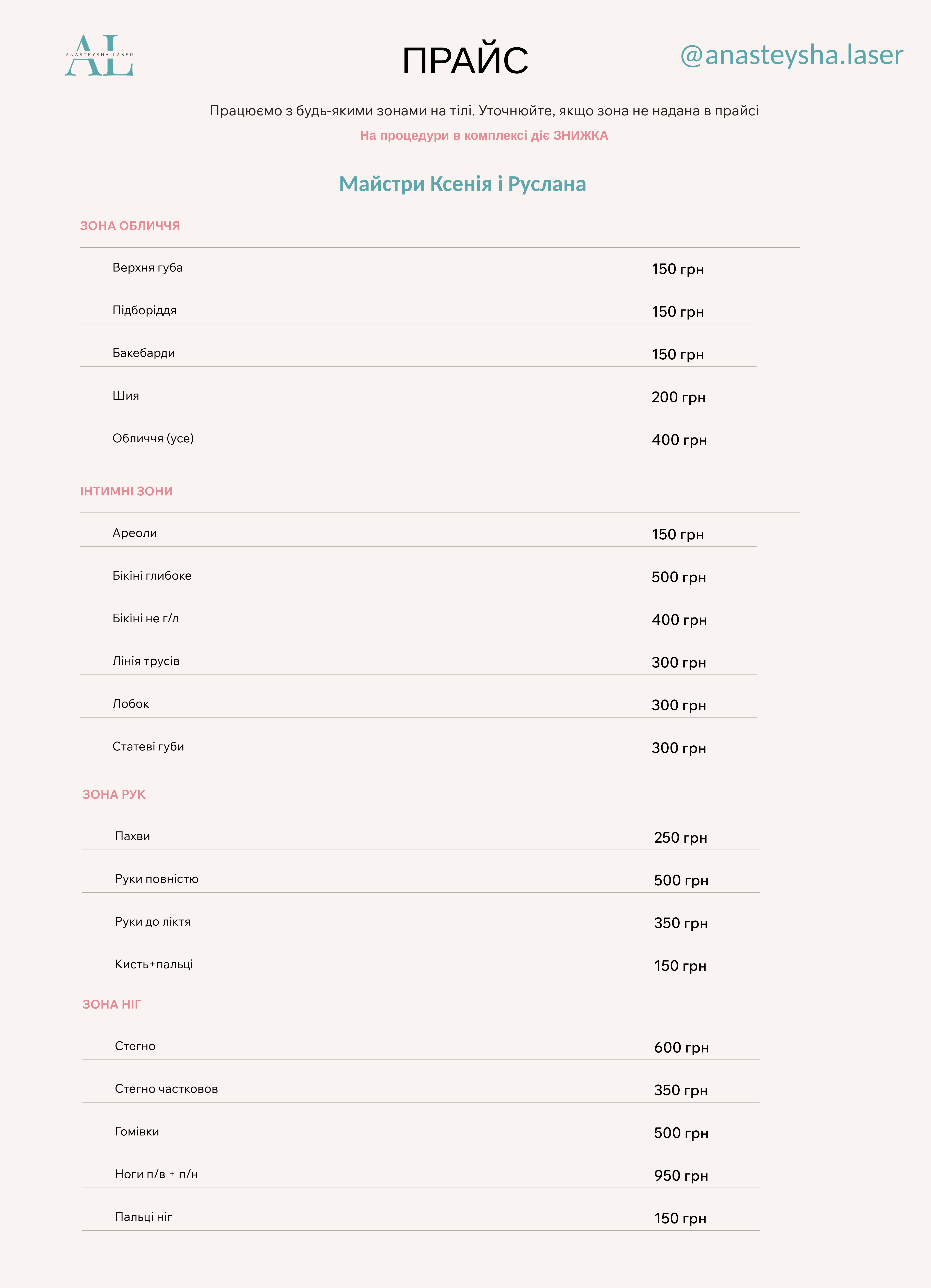 Працюємо з будь-якими зонами на тілі. Уточнюйте, якщо зона не надана в прайсі